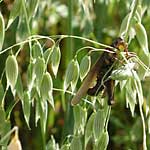 Because of a very dry spring and long stretches of rainless weather, grasshoppers have become a problem in many areas of Alberta this year. I didn't get a photo of one of the thousands of live, hopping ones, but this shell left by a moulting grasshopper is a reminder of the weather and the insect infestation. See larger photo. |