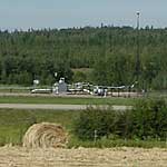 The oat crop was seeded on rich loam soil with an air seeder, and with a nurse crop of clover hay. It is very evenly and densely grown at the ground level. The field was not sprayed, so there are no tractor tracks. No vehicles had entered the field after seeding to the time of swathing. It's impossible for any person to walk through this crop without crushing plants and leaving an obvious trail. The farmers checked very carefully to find tracks in the field, or between the two circles, but there were none. One of the farmers was up very late the evening before the formation was discovered, tending a fussy baby. She spent some time outdoors on her deck. It was a warm, calm, dry night. She says if there had been trespassers in the field, which is visible from the house, she would have heard or noticed something. None of the horses, dogs, donkeys or llamas in the immediate vicinity showed any signs of upset during the night. |