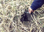 Several small mounds of fresh earth appear to have erupted from the ground. We did not find any of these mounds in the centers of circles. In the large circle, there was a small mound of earth about 12 inches (30 cm) across that looked as if it had been pushed up from the earth below. The fresh earth around the edges lay on top of some of the downed crop, indicating that it fell there after the plants were laid. The laid crop swirled around this location in a semi-circular pattern. I show the location on the Lay of crop diagram.