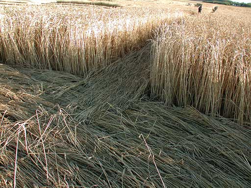 Plants were bent sideways at an angle.Very few plants in this area were lying parallel to the pathway.